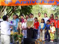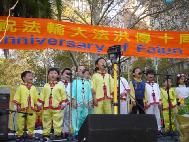 【明慧网2002年5月17日】大法洪传十年,普天同庆,悉尼明慧小学的小弟子们在庆祝会的功法表演别具一格,稚气顽皮的小班及小小班学生坐在莲花盘里打坐犹如婴孩一般可爱。孩子们身着彩色薄纱表演带有芭蕾动作的舞蹈,恰似仙女飞天一般,不同班级孩子们身着民族服装的大合唱更是引人注目,从小得法有佛缘的孩子们演唱了《我是大法小弟子》,场上孩子们嘹亮的歌声赢得了热烈掌声。