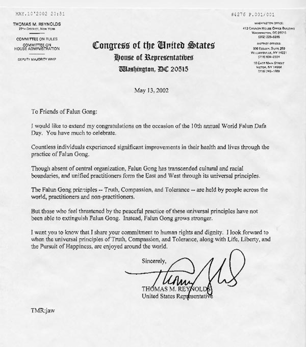 美国北卡议员鲍勃.埃思里奇(Bob Etheridge)4月9日在给当地法轮功学员的回信中表示中国政府必须改进它的人权记录并履行它的国际承诺。