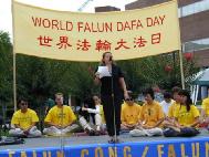 正午12点,庆祝仪式正式开始,法轮大法学生俱乐部主席首先了介绍世界法轮大法日的特别意义,并邀请大家一同静默一分钟向以生命捍卫真善忍的中国法轮功学员致敬,学员们同时发正念。之后,大赦国际的女发言人发言并倡议每个人都行动起来帮助停止镇压。