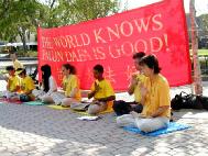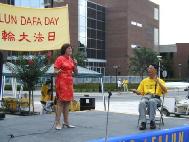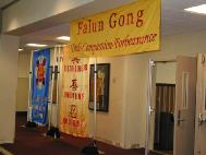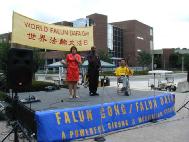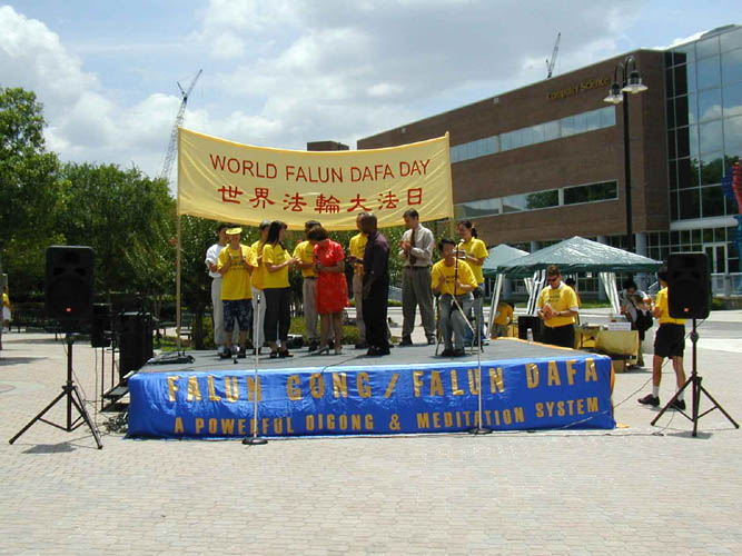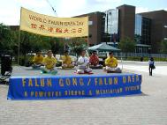 优美舒缓的功法演示、纯洁的音乐和多彩的横幅吸引来络绎不绝的师生驻足,他们绝大多数拿了资料,许多人还签名表示支持并参观了图片展。学员在一天的庆祝活动中收集了数百个签名。室外庆祝活动在下午6点结束。学员们移到室内学法交流,最后大家以发正念结束全天的活动。