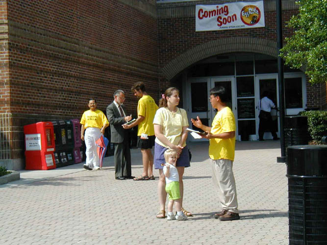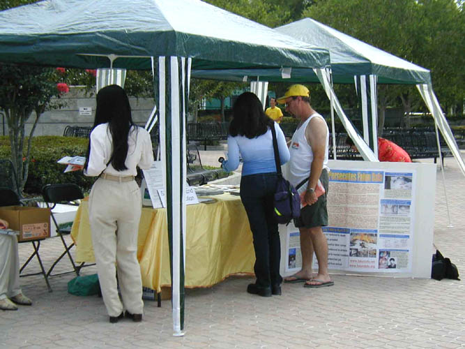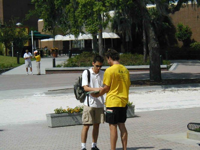 【明慧网2002年5月17日】5月13日星期一,佛罗里达各地大法弟子在奥兰多中佛罗里达大学庆祝世界法轮大法日。庆祝活动在校园的学生中心举行,中佛罗里达法轮大法学生俱乐部组织了这次庆祝。该大学有约3万学生,学生中心是校园中最繁忙的地段之一,为大法弟子们提供了非常好的洪法和救度世人的机会。