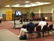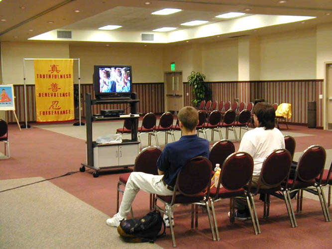 学校为这次活动提供了学生中心的一个大展厅和大楼前面的舞台及空地。学员们在中心门口悬挂了“法轮大法”横幅,在展厅布置了图片展并全天连续播放真相录像,图片展包括炼功照片、迫害真相及艺术家学员的作品。在室外,学员们布置了两张桌子向过往师生提供大法资料并征集签名。学员们用漂亮的大法横幅“世界法轮大法日”、“真-善-忍”、“全世界知道法轮大法好”等精心装饰了学生中心外的舞台。