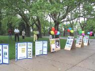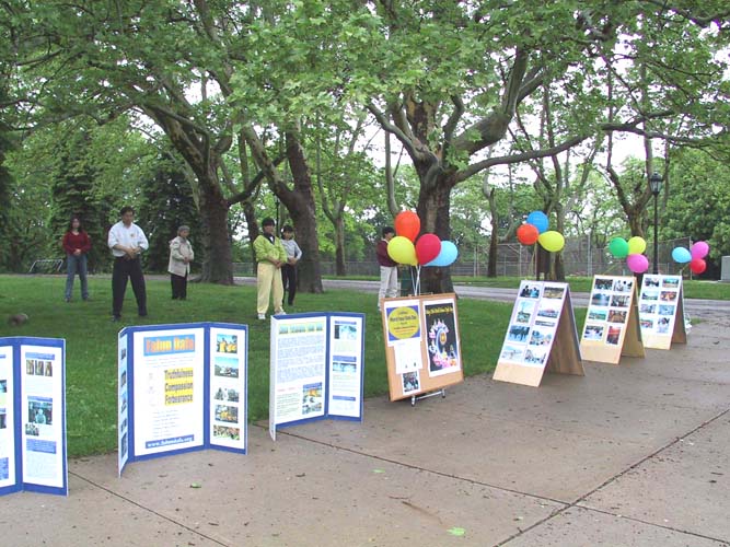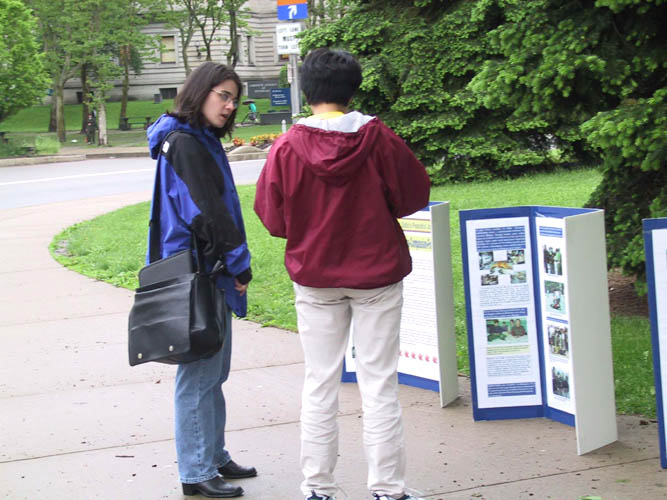 下午,凉风裹着雨水飘了过来。悠扬的大法音乐在雨中显得更加宁静祥和。行色匆匆的行人被感动了,不停地有人驻足观看和提问。一位黑人女子停下车直奔我们而来,原来她已经有机会读到了大法的书并自己在家里炼功,她非常高兴能够找到我们。还有一位年轻的女子停下来告诉我们,她亲眼在天安门广场看到了大法弟子和平请愿,也看到了警察如飞而至,暴力抓打大法弟子的情景,她说这种暴力行为当时使她完全震惊了。还有不少人询问在哪里可以学功。