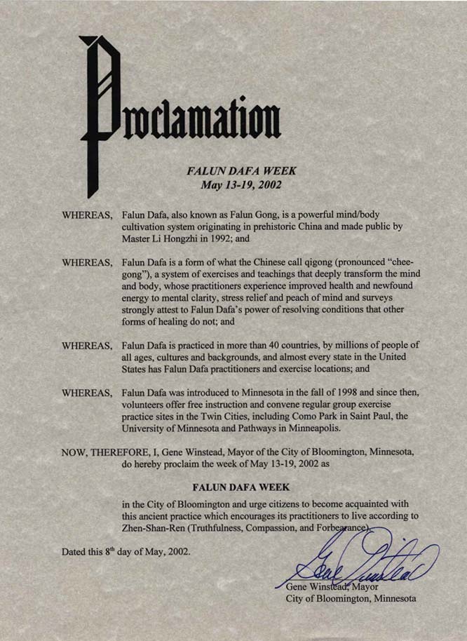 鉴于,法轮大法于1998年秋传入明尼苏达州,从那时起,志愿者们在双子城,包括圣保罗的科莫公园、明尼苏达大学及明尼阿波尼斯的派斯维思(PATHWAYS)提供免费辅导,并定期集体炼功。