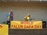 下午6时许,演出在五位身穿金黄色炼功服的学员优美的功法展示中拉开了序幕。接着一位美国学员简单介绍了法轮大法和法轮大法日的由来。然后学员们登台献艺,有小提琴演奏“普度”,吉它伴奏的歌曲“得度”、“云里追”,和用风笛(BAGPIPE,爱尔兰乐器)演奏的纪念被迫害致死的大法弟子的乐曲。演出中穿插了对节目和演员的介绍,这里面有修炼后绝症不翼而飞的神奇,西人学员走上天安门歌唱“得度”使警察落泪的动人,王丽萱母子被迫害致死的哀惋,也有赵明历尽艰辛不屈归来的振奋。风笛的演奏特别打动了一位观众的心,她与大法弟子交谈后答应写信给政府官员表达对法轮功受迫害情况的关注。许多人都关切地询问着中国国内的情况,对法轮功学员的勇气表示钦佩,并说这么好的功法被禁止实在太不可思议了。另一些人马上就想学功,一个越南女孩说,她想学法轮功已经想了好久,现在终于联系上了。