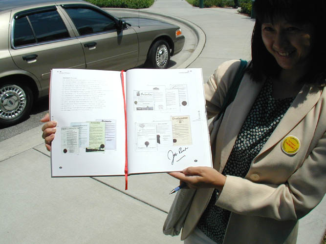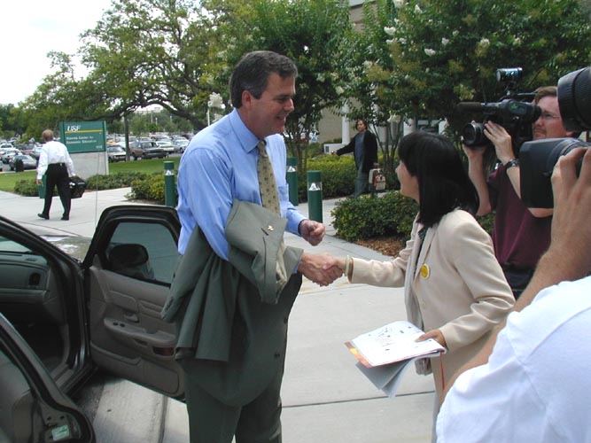 【明慧网2002年5月19日】5月16日上午11点,佛罗里达州新教育法案签字仪式在南佛罗里达大学进行,佛罗里达州州长杰.布什及其他重要政界官员出席了该仪式。坦帕学员抓住机会,面对面向布什州长呼吁帮助停止镇压法轮功。在布什州长入场前,两名学员们选择了很好的位置就座,另一名则站在了入口处。布什州长入场首先就与学员握手,学员极简单的介绍了自己因修炼法轮功而被迫害的情况并要求布什的帮助,布什州长说,“没有问题(ABSOLUTELY)”他亲手接过了学员们准备的资料并保证会了解此事。