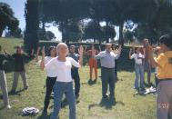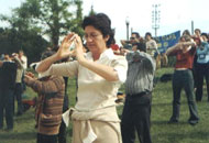 一批又一批参观者前来学习法轮功五套功法(2)博览会主办者之一MONTSE女士也加入炼功行列瞧!学得多认真。