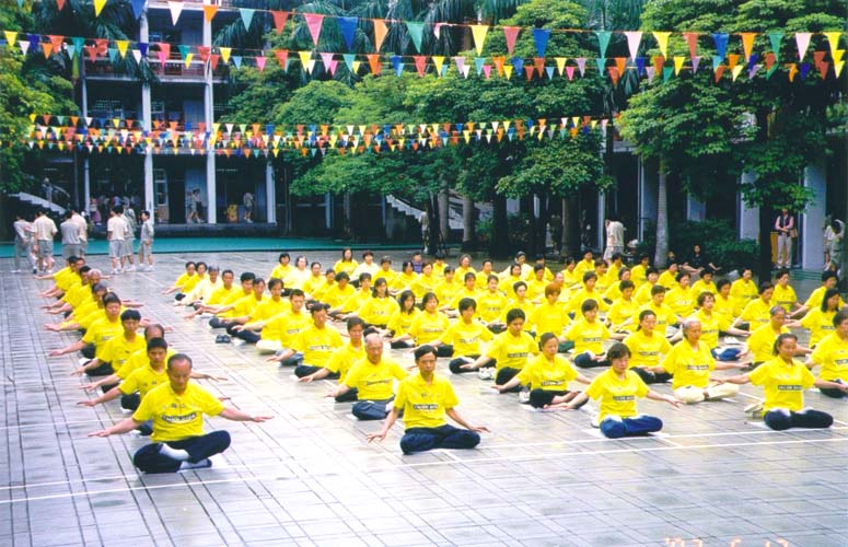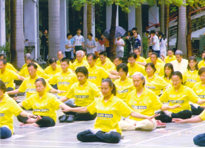 五月十七日(星期五)一大早就一直阴雨不断,真令人心中不快,跟着到了九点左右,学校陆续宣布停止教职员工的趣味竞赛以及学生的班际2000公尺的大队接力比赛,这个情势似乎很不妙,当天预定在上午十一点到十一点半举行三十分钟的功法表演。到了十点,学员们陆陆续续的进入了校门,并已在校园内洪法、发传单、讲清真相,十点半左右,学员已超过了百人,大家先在礼堂中放置随身物品,并做休息与准备,此时大家一致决定风雨无阻的进行本次的活动。到了十点四十五分开始整队进入会场,十一点开始准时功法表演,此时虽然阴雨依旧,却已小了许多,唯一遗憾的是录音机却出了状况,在不断的毁损录音带及更换录音机及录音带之下,总算度过了这一关,结束时却也耽误了十分钟之多。这是我们正念的不足所致,一定要向内去找。值得一提的是,学员们情绪并未受影响,此情况一致获得在场教职员工们的赞叹与惊讶。