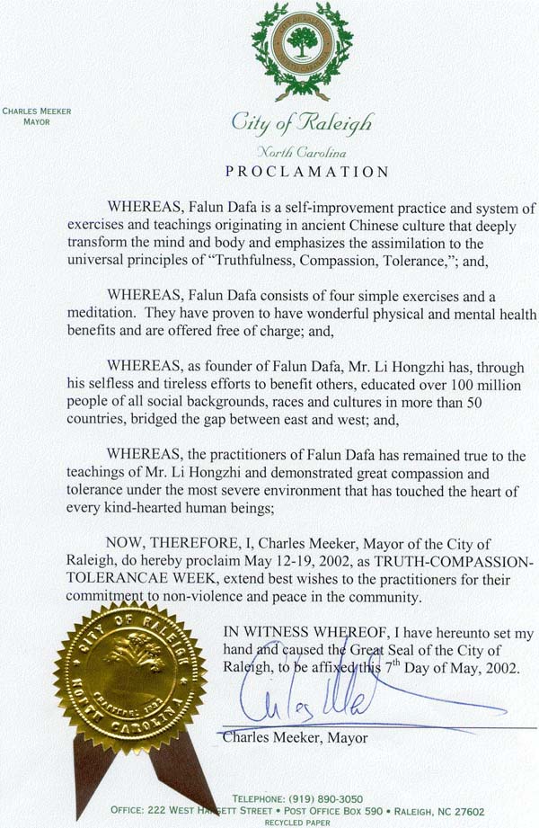 【明慧网2002年5月22日】2002年5月7日,美国北卡罗来那州瑞利市(City of Raleigh)市长查尔斯.E.米科(Charles Meeker)宣布2002年5月12日至19日为瑞利市的“真善忍周”。查尔斯.米科市长在褒奖状中赞美李洪志先生作为法轮大法的创始人,为造福他人而无私、孜孜不倦地奉献,教导了世界上50多个国家来自不同社会背景、种族和文化的上亿人民,架起了东西方沟通的桥梁。并说,法轮大法学员忠实于李洪志先生的教导,在最严酷的环境下表现出大善大忍,已经打动了每一位善良人的心。褒奖状译文如下。