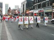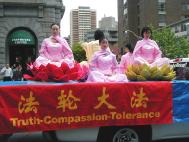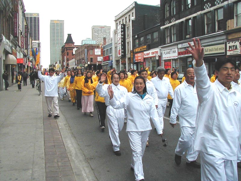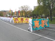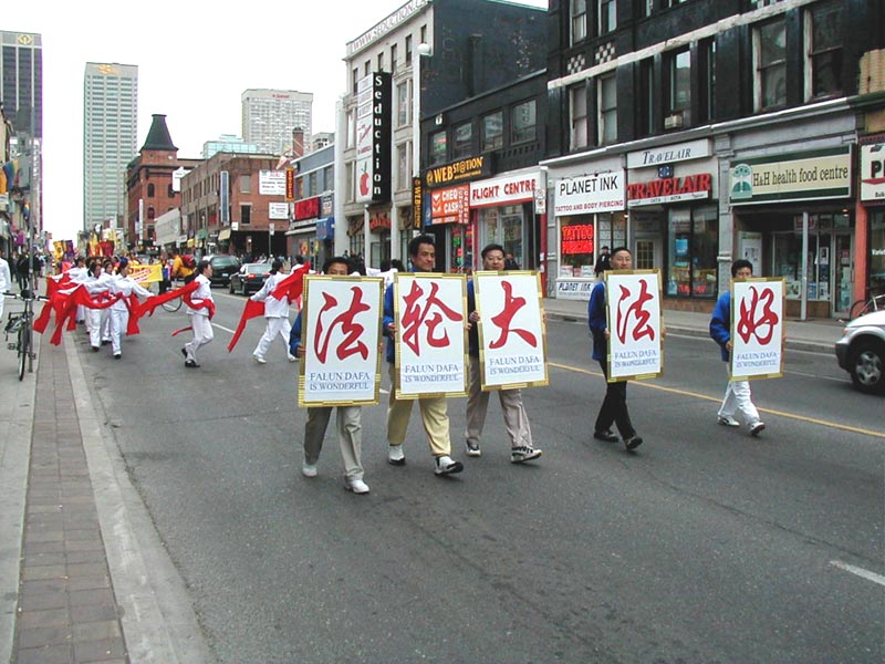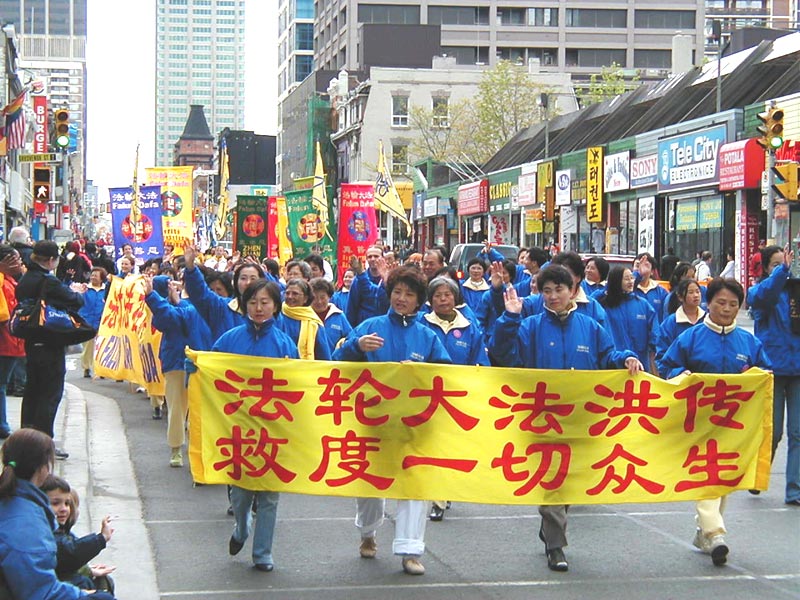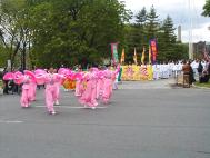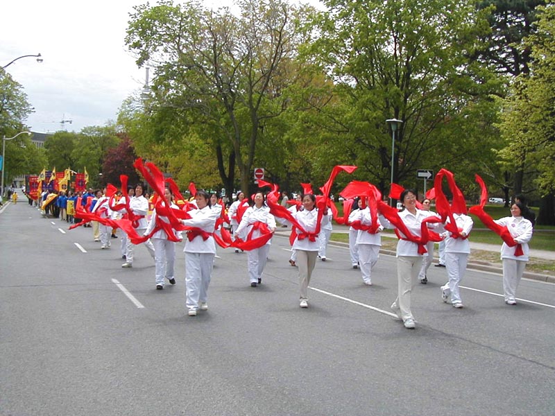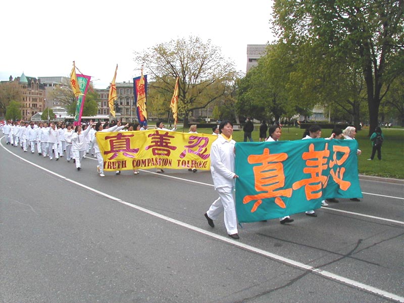 【明慧网2002年5月22日】5月20日(星期一)是加拿大女王诞辰纪念日,由加拿大政府机构主办,在多伦多市中心的安大略省议会前举行了隆重的庆祝仪式和大型庆祝游行。省督亲自到场讲话,部分政府要员也出席了庆典。游行队伍中有军方仪仗队和社会上的各类社会团体。当地法轮功学员首次应政府的正式邀请参加了游行庆祝活动,这显示加拿大政府和人民对法轮大法的普遍认同与支持。