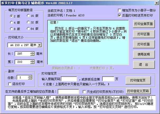 1、支持两版合一、四版合一、八版合一、……最高支持64版合一(按“骑马订”格式在一张纸上打印64个小页面),因此可以打出超小版本的书籍来;