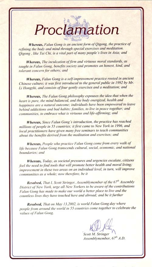 现决议,我,纽约州第67选区议会成员斯高特-斯准尔(Scott M. Stringer)敦促所有纽约市民认识到法轮功为创造一个更加美好的世界所做出的贡献,以及他们对国内外无数人的生活的触动;并进一步决议