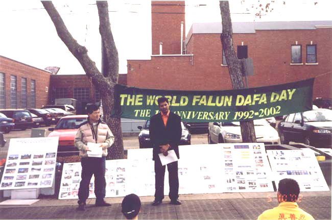 五月十一日,爱民顿大法弟子齐聚“亭子公园”举行庆祝活动。公园坐落在全市每周一次的农贸市场旁边,车水马龙,热闹非凡。晴朗的天空不时冒出片片阴霾,张牙舞爪涌过来。在学员们强大的正念下,邪恶最终败下阵来,庆祝活动得以顺利进行。学员们宣读了来自临近城镇包括伍德水牛城(Fort McMurray)、莫林维尔市(Morinville)、格兰德伯爱瑞市(Grande Prairie)等授予“法轮大法月”的褒奖令,以及爱民顿国会议员詹姆斯.拉乔特(JAMES RAJOTTE)等发来的贺信。令人感动的是,国会议员拉依姆.詹弗(RAHIM JAFFER)于十日深夜从渥太华赶回,他不顾疲劳,专程到场表示祝贺,并表达其将与其他加拿大国会议员一道,共同努力,为法轮大法在中国受到的残酷迫害而呼吁的决心。之后,学员们表演了五套功法。络绎不绝的行人纷纷驻足观看展板和功法表演,索取资料。本地媒体亦对此加以采访。活动取得圆满成功。