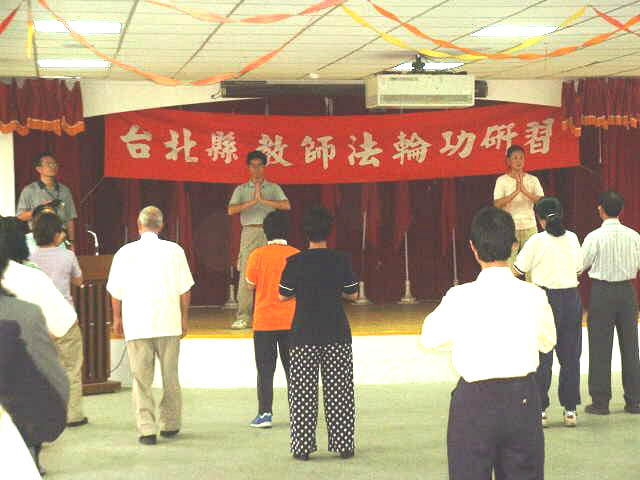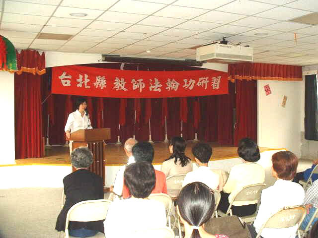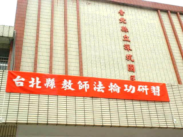 在研习活动的同时,在深坑乡闹市区内有一群法轮功学员步行举横幅游行,吸引了更多的有缘人,活动最后我们教与会老师们炼功,活动圆满结束。