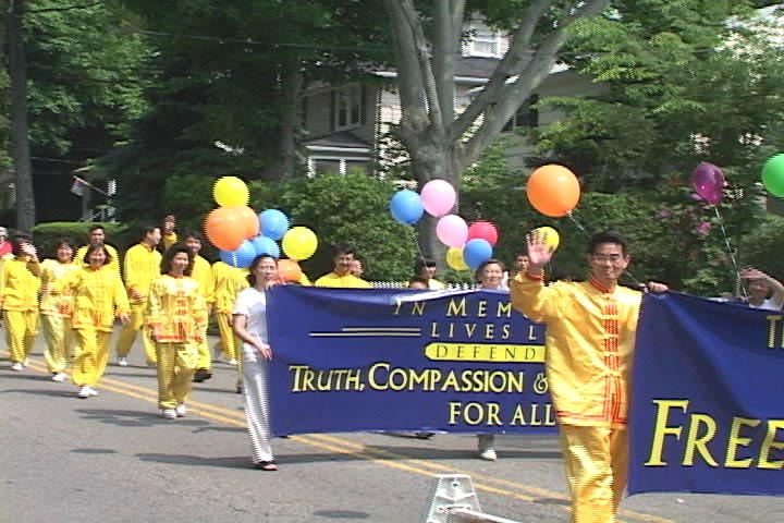 游行开始后,来自纽约的法轮功学员舞着狮子走在游行队伍的前面,学员们精湛的表演吸引了街两旁的观众。接着是四名身着仙女服装的女学员,随着“普度”音乐翩翩起舞。最后是近二十名身穿金黄色炼功服的学员,他们不时地为观众表演功法,博得了一阵又一阵的掌声。学员们游行所到之处无不受到市民们的热烈欢迎,许多华人居民也向学员们频频招手致意或鼓掌表示欢迎。另外还有几位学员一路向街两旁的市民发介绍法轮功的小册子和揭露中国政府镇压法轮功的英文报纸。不少市民对中国政府镇压法轮功的罪恶行径表示愤慨,另有些市民看了学员的功法表演后表示要到炼功点来学功。