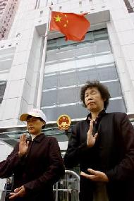 图片:三月份,法轮功学员在香港中联办外面打坐炼功。路透社/鲍比.叶摄