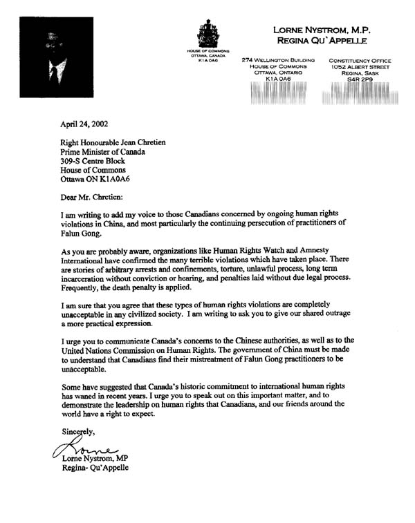 • 加国会议员洛恩.尼斯通写给加拿大总理克雷蒂安的信