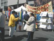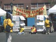 大法学员已是第二次参加这个集会。黄底红字的中英文“法轮大法好”悬在两个大展板上,非常醒目。生动形象的展板向人们展示着大法的洪传,江泽民的无耻迫害,和大法弟子不畏艰险坚持真理的无私牺牲精神。功法演示吸引了很多游人驻足观看。大法弟子祥和慈悲的精神状态,优美舒展的功法动作,整个能量场非常温暖和谐。欢喜的人们纷纷索取大法资料,到结束时,最后一张资料也送了出去。