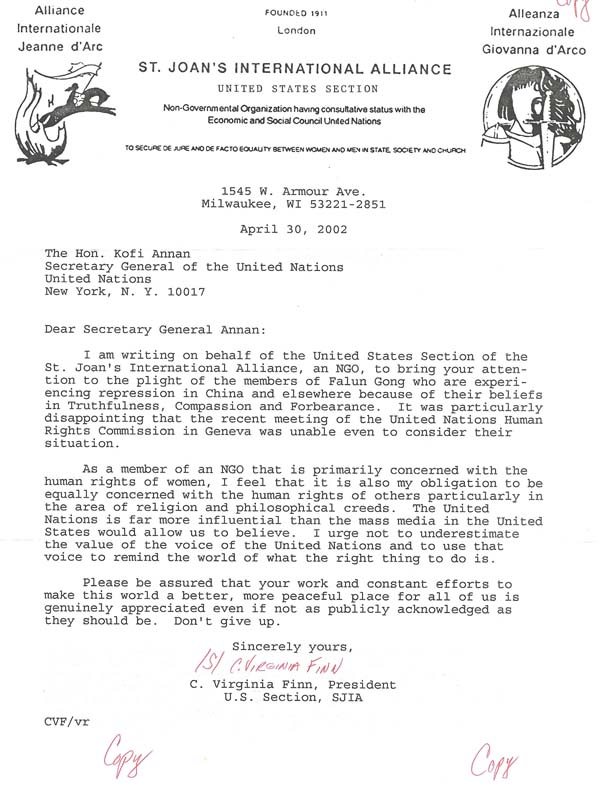 我代表圣琼安国际联盟(一非政府组织)美国分部向您写信,要求您关注因信仰真善忍而被中国(江泽民集团)镇压的法轮功学员们的艰难处境。我们对最近在日内瓦召开的联合国人权大会未能考虑他们的处境而失望。