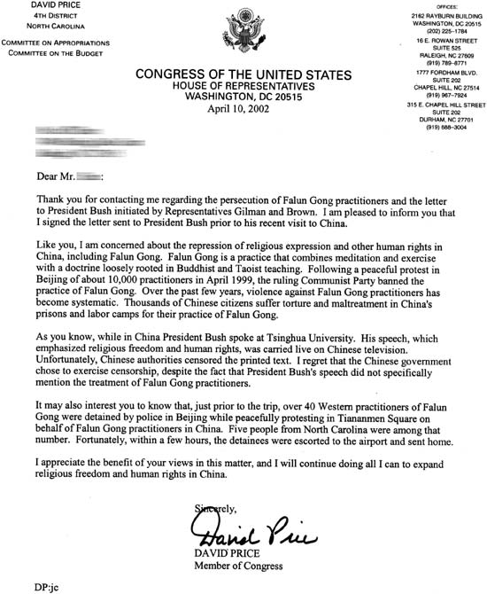 【明慧网2002年5月7日】美国北卡罗莱纳州议员大卫.普瑞斯(David Price)四月十日致信当地法轮功学员,表示对中国镇压包括法轮功在内的宗教信仰以及其他人权运动的关注。