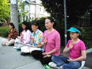 2002年6月7日,纽约学员在中领馆外发正念。现在大家每天坚持在这里发传单和发正念。