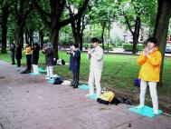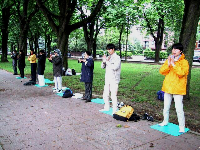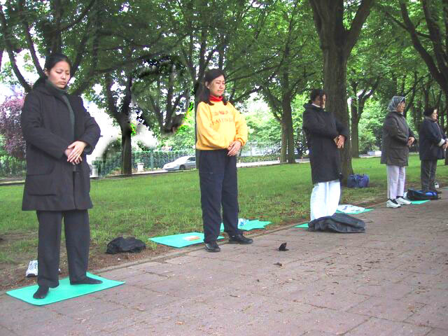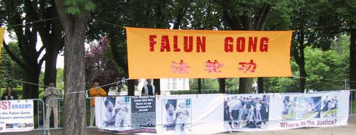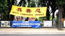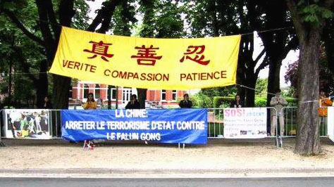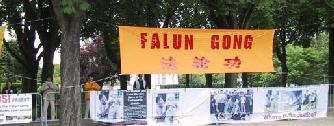 在整个活动过程中,有一个蛮有意思的小插曲。当我们刚挂上横幅,摆好图片,即有一车中国游客到使馆参观。他们下车后先是一惊(不知道在这儿会碰上法轮大法修炼者的和平抗议), 继而被光焰夺目的大法横幅及平静祥和的弟子们所吸引,纷纷取出相机争相拍下这美丽祥和的场面。有一些游客友好地接过大法弟子递上的真相资料。