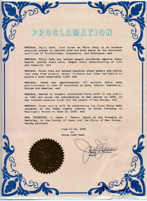 鉴此,我,杰森. 瓦瑞诺,新泽西州大洋县柏克莱市(Township Of Berkeley)市长,宣布2002年6月10日至16日为