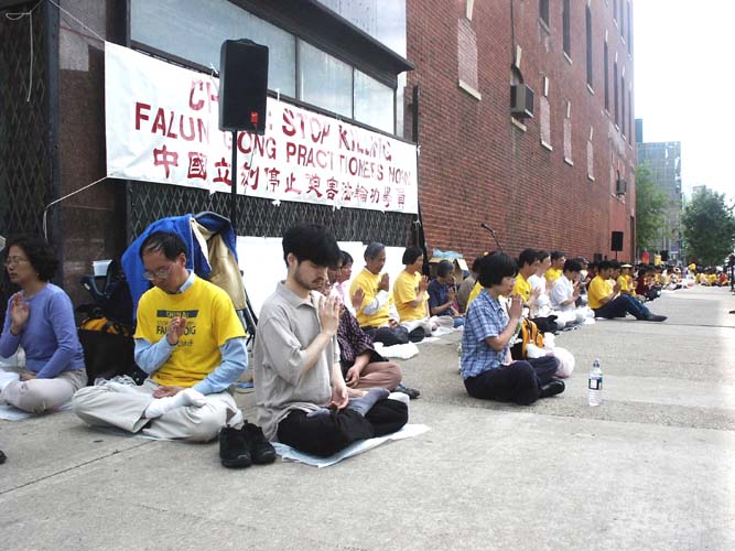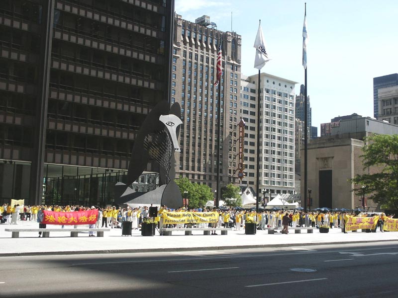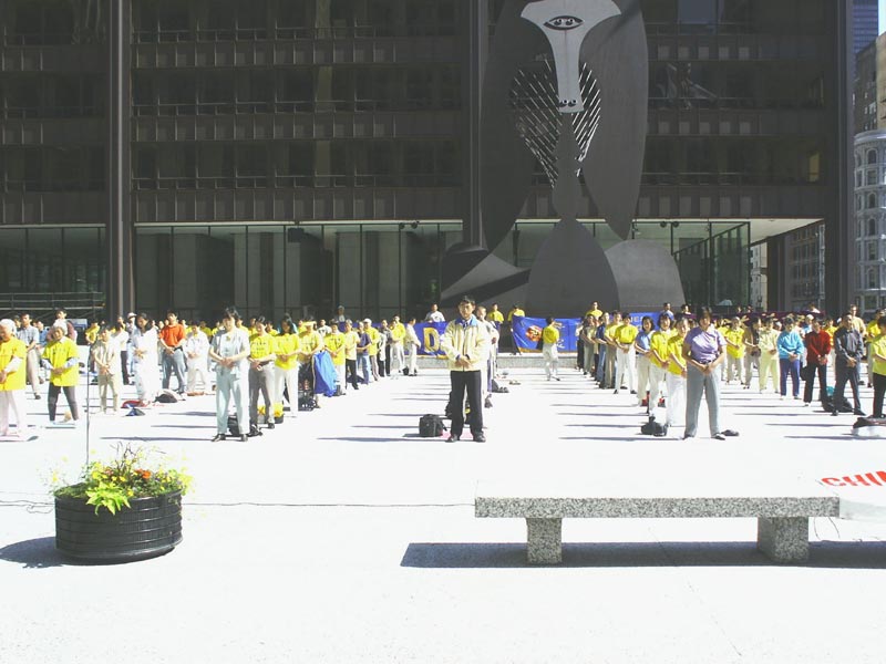 15日早晨九时,来自美洲地区及美国各地的学员聚集到戴利广场集体炼功,发正念,并举行新闻发布会。