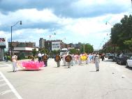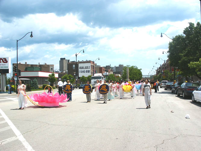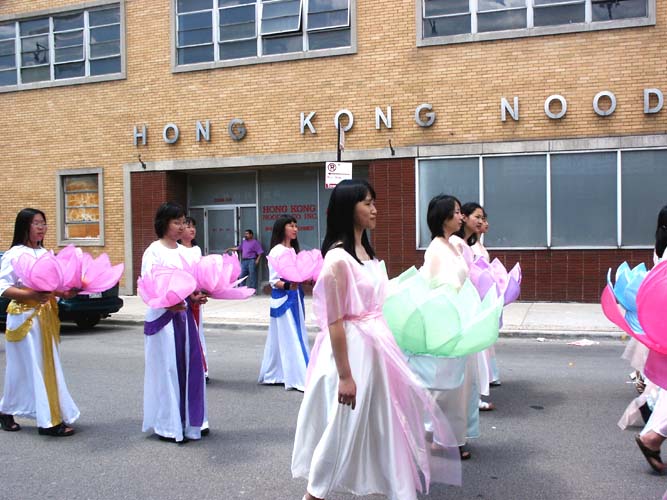 在这场迫害中,中国人民是受害最深的,向中国人民讲清真相是当前最重要的大事之一。本次法会安排了中国城的和平游行,游行的队伍由学员特制的大莲花领头,大约400多名学员,举着横幅,排着整齐的队伍。游行队伍祥和,愉快。学员们唱着法轮大法好的歌曲缓缓走过中国城。路人停下了脚步,静静地观看我们的游行。中国人都很乐意接受大法资料。游行后,学员们分别去了不同的餐馆,继续向世人讲真相。