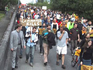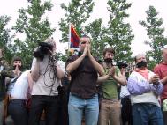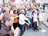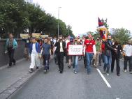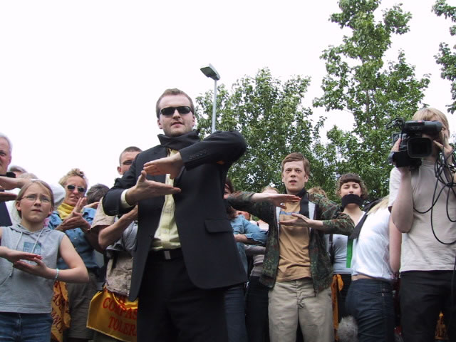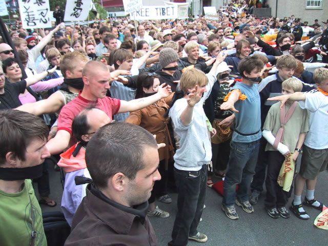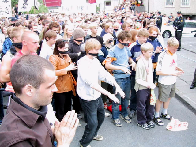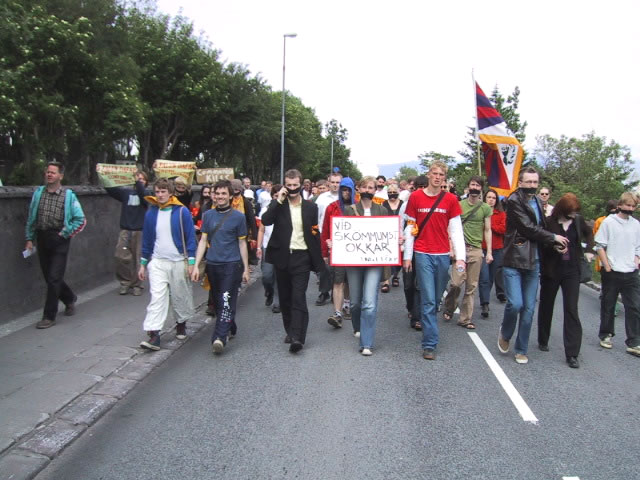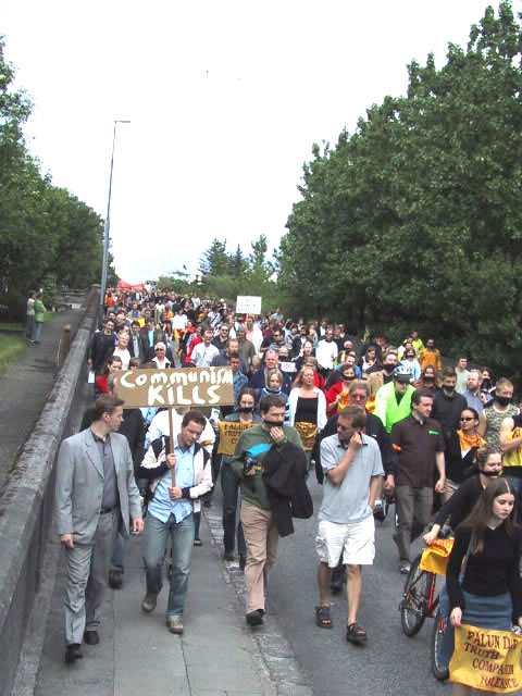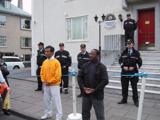 6月14日江泽民在冰岛访问期间,人口有限的雷克雅维克举行了近三千人(原定一千人)的大规模示威,抗议到访的江泽民对法轮功学员的人权侵害。示威群众手举法轮功横幅,用黑布条封口,以示对冰岛政府违背民意、错待法轮功的不满。