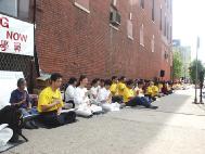 星期六,参加法会的学员一起来到了中领馆,中领馆正侧面都整齐地坐着大法弟子。学员每半个小时发一次正念,直到晚上11点以后才离开。有些学员还留下来通宵发正念。