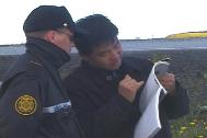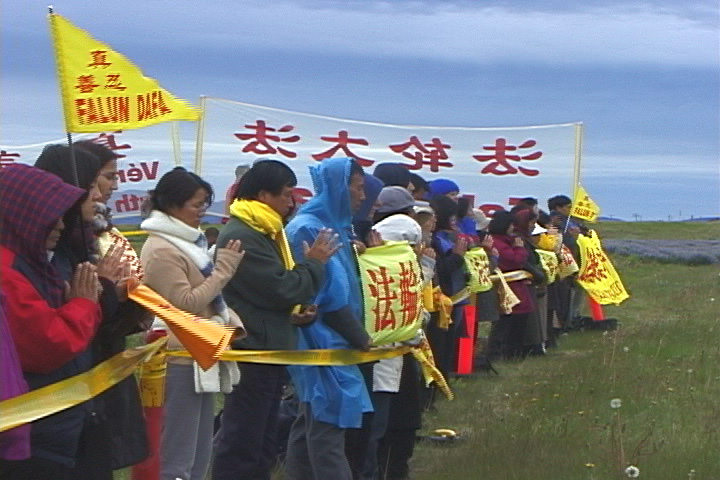 满载着大法弟子的巴士六时许起程到达指定地点。此时天空乌云渐密,阴风渐起,大法弟子有序地展开横幅,同时与值勤的警察说明为什么我们来到此地的原因,气氛祥和而平静。有位警察向我们透露了江XX车队预定到达的时间,并同意负责摄影的学员在江XX车队接近时走上公路拍摄。身穿礼服的警察总指挥表示对我们了解,并说,“等‘他(江XX)’走后阳光又会再度照射你我,一切将恢复平静。”