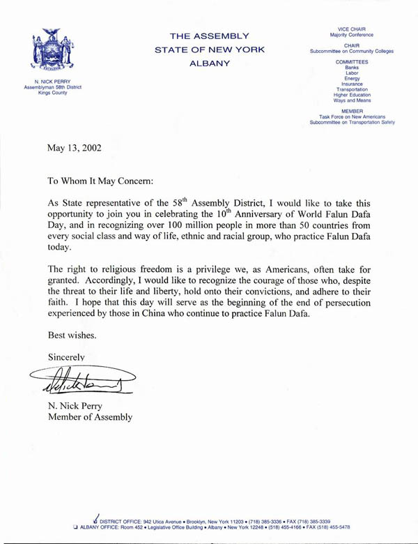 作为第58选区的州代表,我愿意藉此机会与你们一道共同庆祝法轮大法洪传世界十周年,并且赞誉遍布50多个国家、来自社会各阶层、各行业、各文化和种族背景的逾亿名法轮大法修炼者。