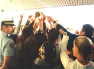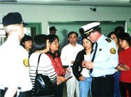 | 弟子们拿着被迫害致死的大陆同修的照片,含泪向警长讲真相。 | 在弟子们到达冰岛之前,邪恶已经向冰岛警察散发了诬蔑法轮功的黑材料,学员们凭着正念和慈悲,耐心地向警察讲真相,所有警察都转变了态度,许多警察在换班回家之前向学员索取大法真相资料。 |