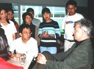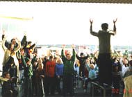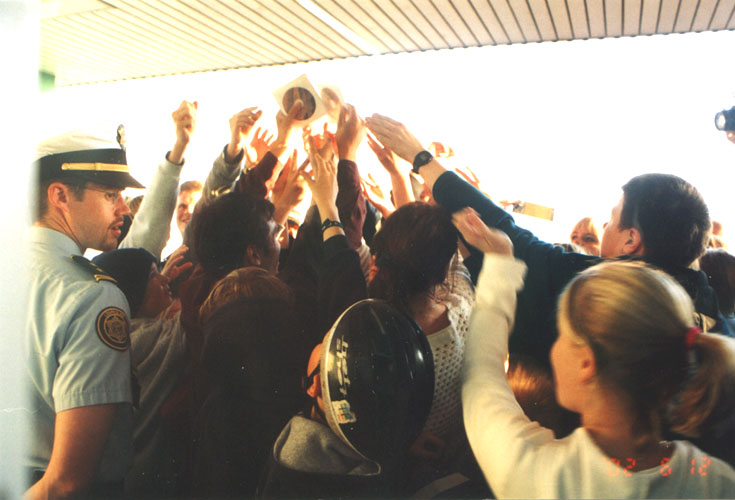 | 来采访的记者看到学员们正在炼功,顾不上采访,先学起功来。前排站的西人面孔者为记者。 | 弟子向来声援的冰岛民众发法轮功真相光盘。只见众生翘首以待,那渴望的眼神像等了几万年,场面感人。 |