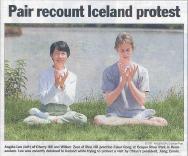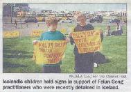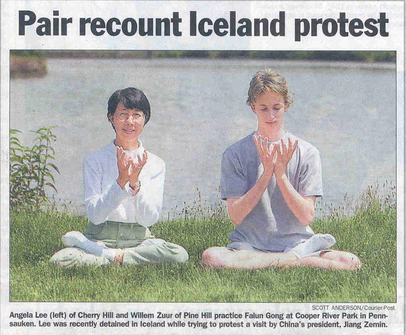 来自樱桃山的53岁的安吉拉.李和来自松树山的17岁的威林.朱儿是去到冰岛抗议中国主席到访的60多名法轮功学员中的两人。中国(江泽民)在1999年将该运动定为非法。