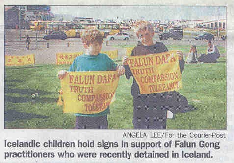 新泽西樱桃山信使邮报(Courier Post)记者苏姗-锡安兹(Suzanne Zionts)6月19日在一篇文章中写道:真、善、忍 ──两位南泽西人上周试图进入冰岛抗议中国主席到访时说以上三个字是他们遵循的法轮功的原理。