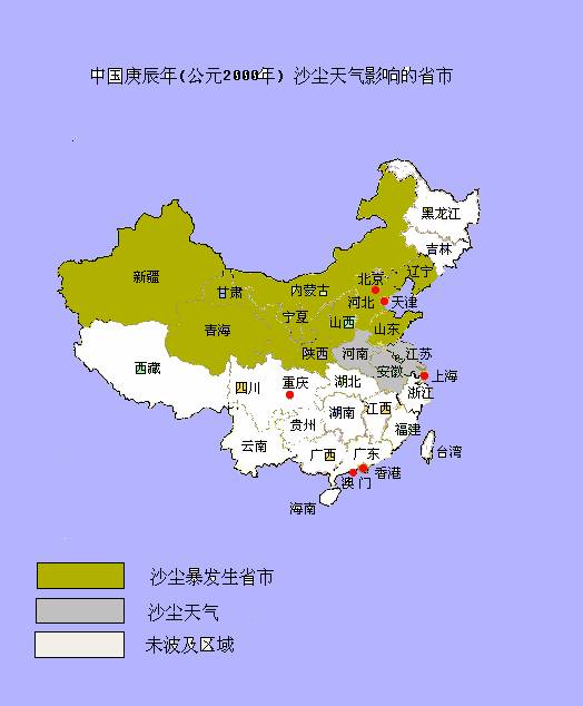 | 10 | 4月7~8日 | 未知 | 西北地区东部、华北中北部,包括北京和天津的部分地区,东北地区中南部将有沙尘天气,其中内蒙古中部和东部偏南地区、河北北部、辽宁、吉林西部和黑龙江南部等地的部分地区有沙尘暴或强沙尘暴,华北南部和黄淮的大部地区将有浮尘或扬沙天气。( 内蒙古、陕西、山西、河北、北京、天津、辽宁、吉林、黑龙江、河南、山东等省)。南京沙尘天气。上海泥浆雨。 |