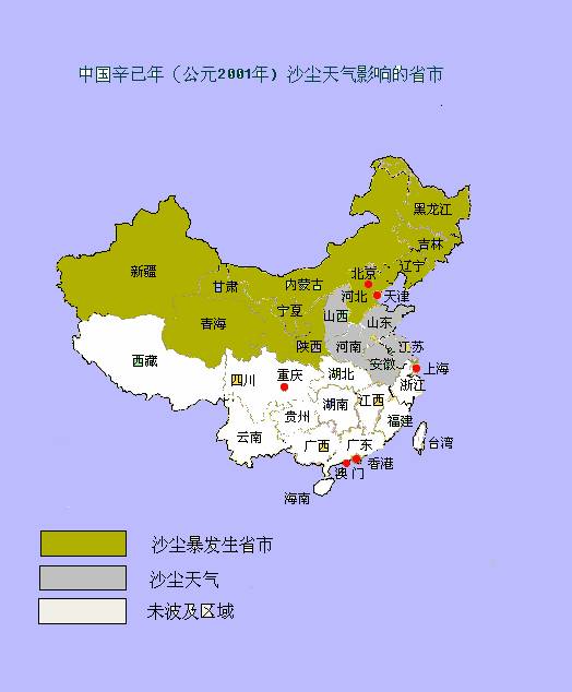 | 4 | 3月18~19日 | 5~7级 | 南疆盆地、甘肃中西部、宁夏、陕西北部、山西北部、河北北部、内蒙古西部出现扬沙。内蒙古中北部的部分地区出现沙尘暴。 |