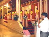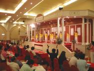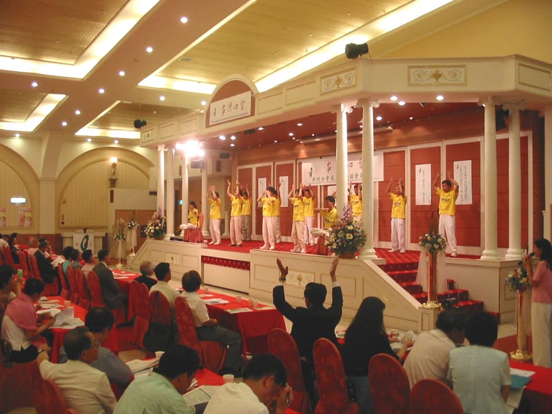 当炼功音乐声响起,全场立即安静无声,整个大厅沐浴在一片祥和的气氛当中,与会出席的150几位专家学者们,无不专注聆赏,整个会场弥漫在大法「真、善、忍」的庄严祥和之场中,非常感人。