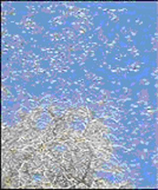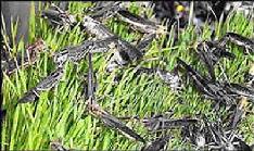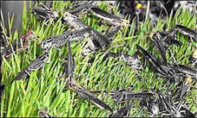 | 图1:被蝗虫压弯的芦苇 | 图2:漫天飞舞的蝗虫 |