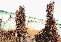 在今年渤海湾的重灾区──天津市郊大港区一带平原,每平方米蝗虫密度达到4000至5000只,把芦苇都压弯了,受灾面积超过35万亩。飞机虽日夜在天空喷射杀虫水,但蝗虫大军仍以不可遏止之势,向北京城浩浩荡荡挺进。 汽车驶出天津市,道旁全是茂密的芦苇丛,野生芦苇一望无际。放眼望去,却不见青绿,反而是一片褐红。蝗虫扫荡之地,所有植物几乎都被啃个精光,人们眼中原是一片青绿的田野,往往经过一晚,便变成黄沙滚滚的荒地。