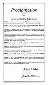 我们同许多其它州、地方和联邦政府机构一起褒奖法轮大法, 因为他作为一种生活准则现已在四十多个国家中吸引了上亿人修炼以达到精神和睦、内心平和及相互理解。
