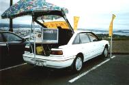 这是我们自己装备的放真相电视的汽车,两边的条幅写的是“为了美好未来,请来了解真相”,“法轮大法,真善忍”。