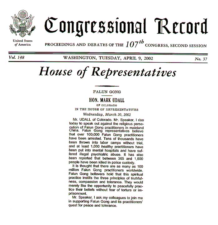 议长先生,我今天站出来直言反对在中国大陆[江氏集团]对法轮功修炼者的宗教迫害。法轮功代表相信已有10万多法轮功学员被捕。数万人未经审判被投入劳教所,至少一千多名健康的修炼者被关入精神病院,受到非法的精神摧残。据报导有365至1600人在被警察监禁期间遭虐杀。