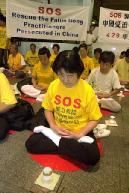 美联社图片:香港市区,星期日晚,2002年6月30日,法轮功修炼者在举行烛光守夜活动时打坐抗议中国大陆对其成员的迫害。