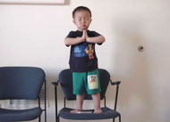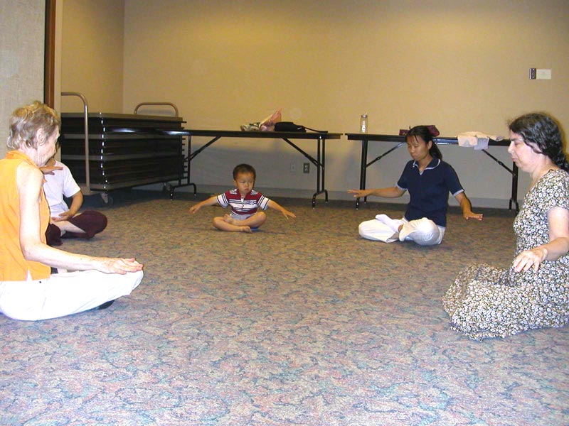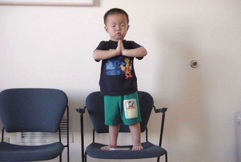 以下是他在大人炼功时自己也在一旁炼功、发正念的照片。