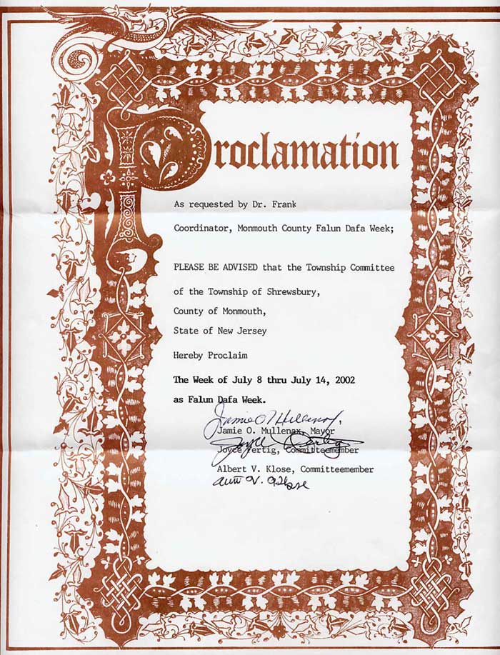 应曼茂斯郡“法轮大法周”协调人弗朗克博士的请求: