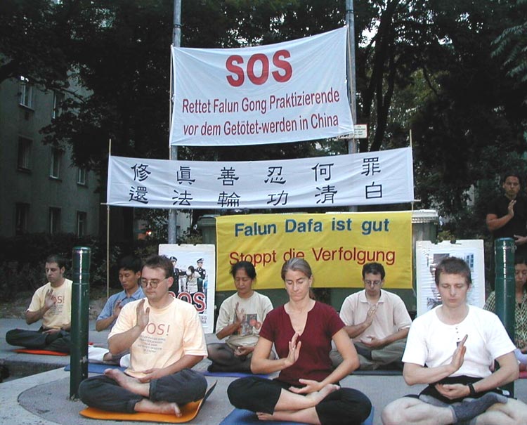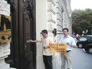 【明慧网2002年7月17日】在中国外交部长唐家璇访问奥地利期间,奥地利大法弟子在中国大使馆前呼吁停止在中国对法轮功的残酷镇压,并写了一封呼吁信给中国外长。中国大使馆的工作人员将大门紧闭,奥地利弟子将呼吁信投入使馆的信箱。同时其他的大法弟子在使馆前持续发正念。
