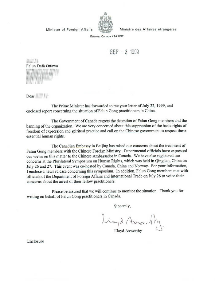 1999年9月3日,当时的加拿大外交部长Lloyd Axworthy先生给法轮功复信时指出:中国要尊重法轮功学员的基本人权,加拿大对中国逮捕法轮功学员、压制法轮功信仰、言论自由表示极其忧虑。信中指出:加拿大多次向中国官方对镇压法轮功表示担忧:包括加拿大驻华使馆向中国外交部、以及加拿大外交部向中国驻加拿大大使、以及加拿大在1999年7月26至27日由加拿大、中国、挪威三国举行的人权会议上对镇压法轮功表示关注、忧虑。